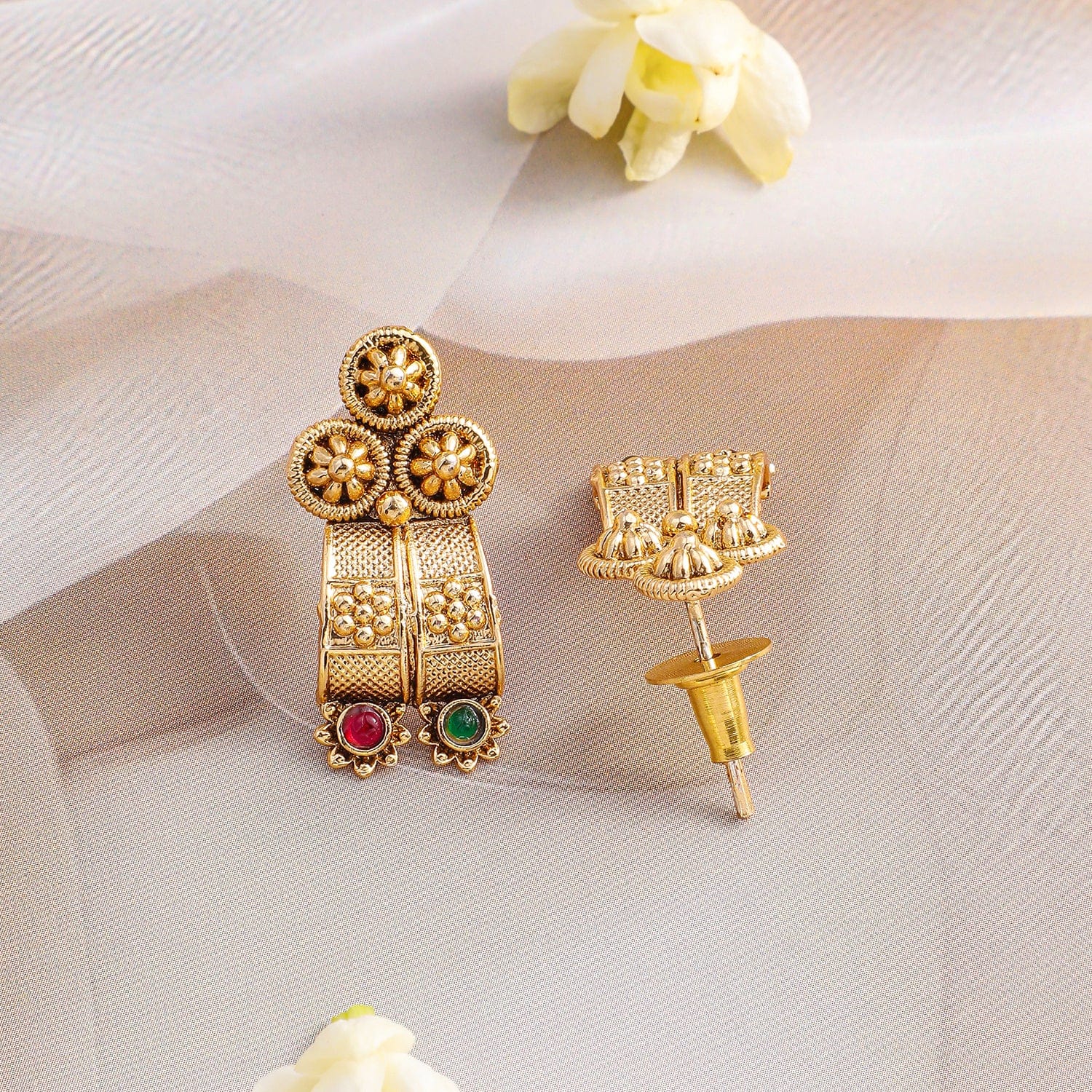 Necklace Set : This 22K gold-plated handcrafted necklace set features intricate detailing with ruby and emerald stones, adding a touch of regal elegance to any outfit.