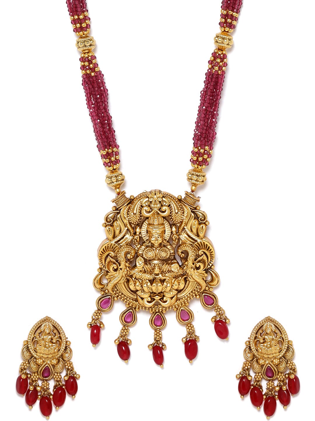Rubans 22K Gold plated Striking Ruby Red Beaded handcrafted Temple Necklace Set