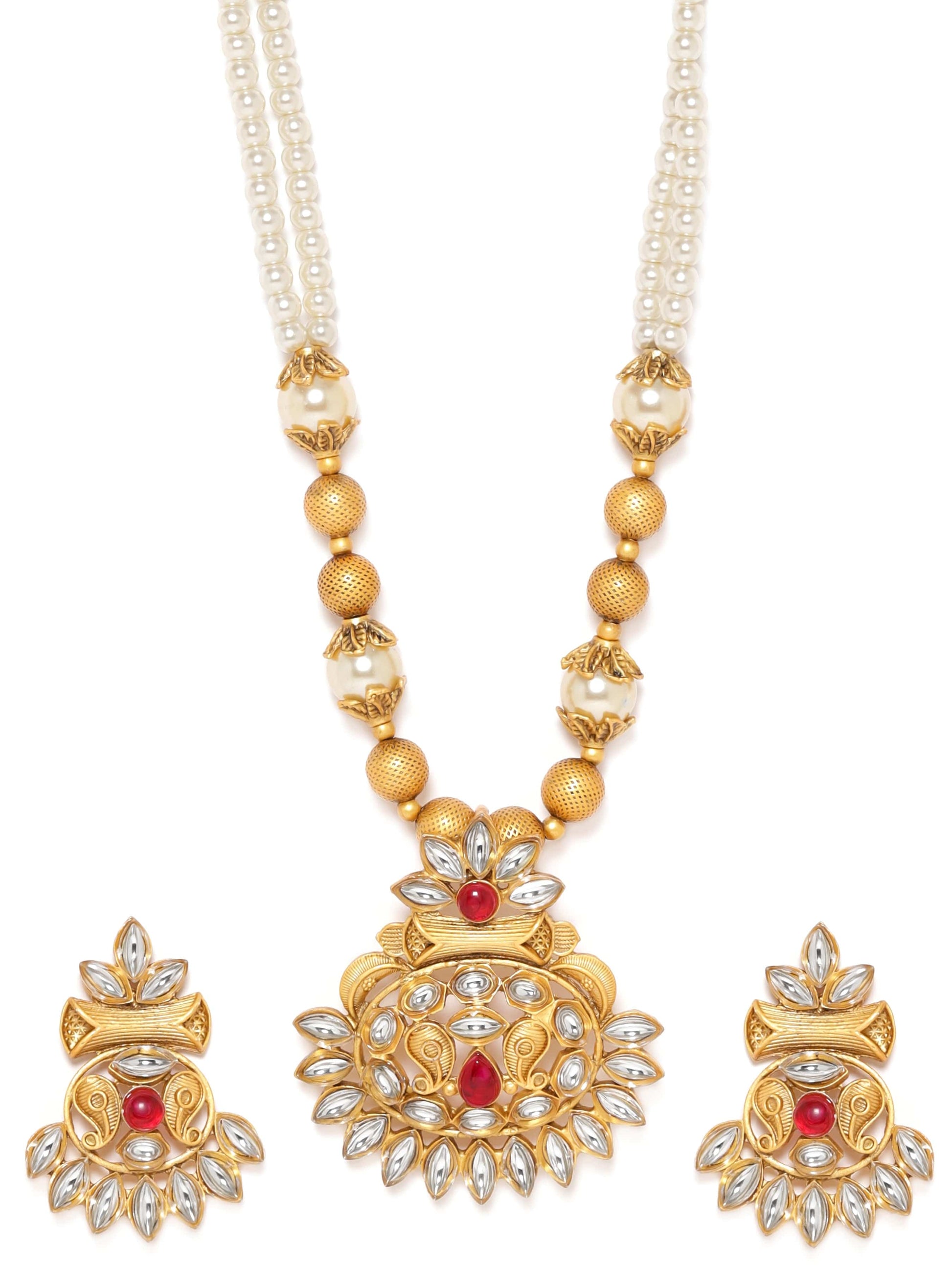 Rubans Gold-Colored Pendant Necklace Set with White Beads and Small Stones