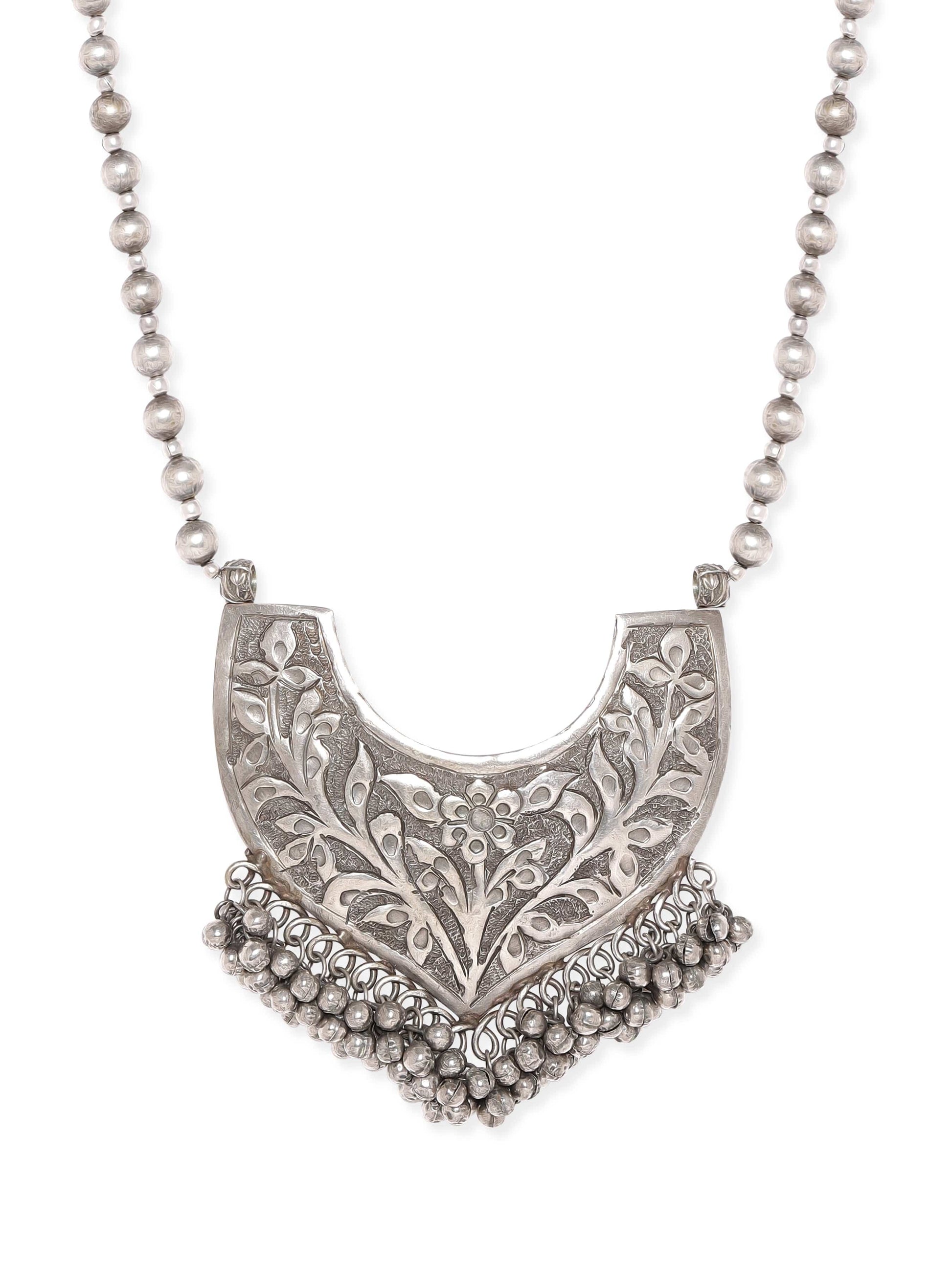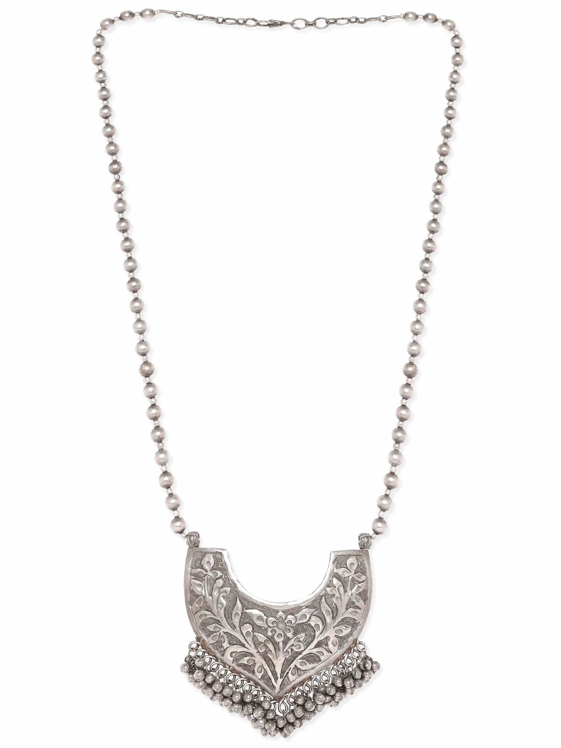 Rubans Oxidized Silver Plated Embossed Statement Pendant & ghungroo detail Long Necklace