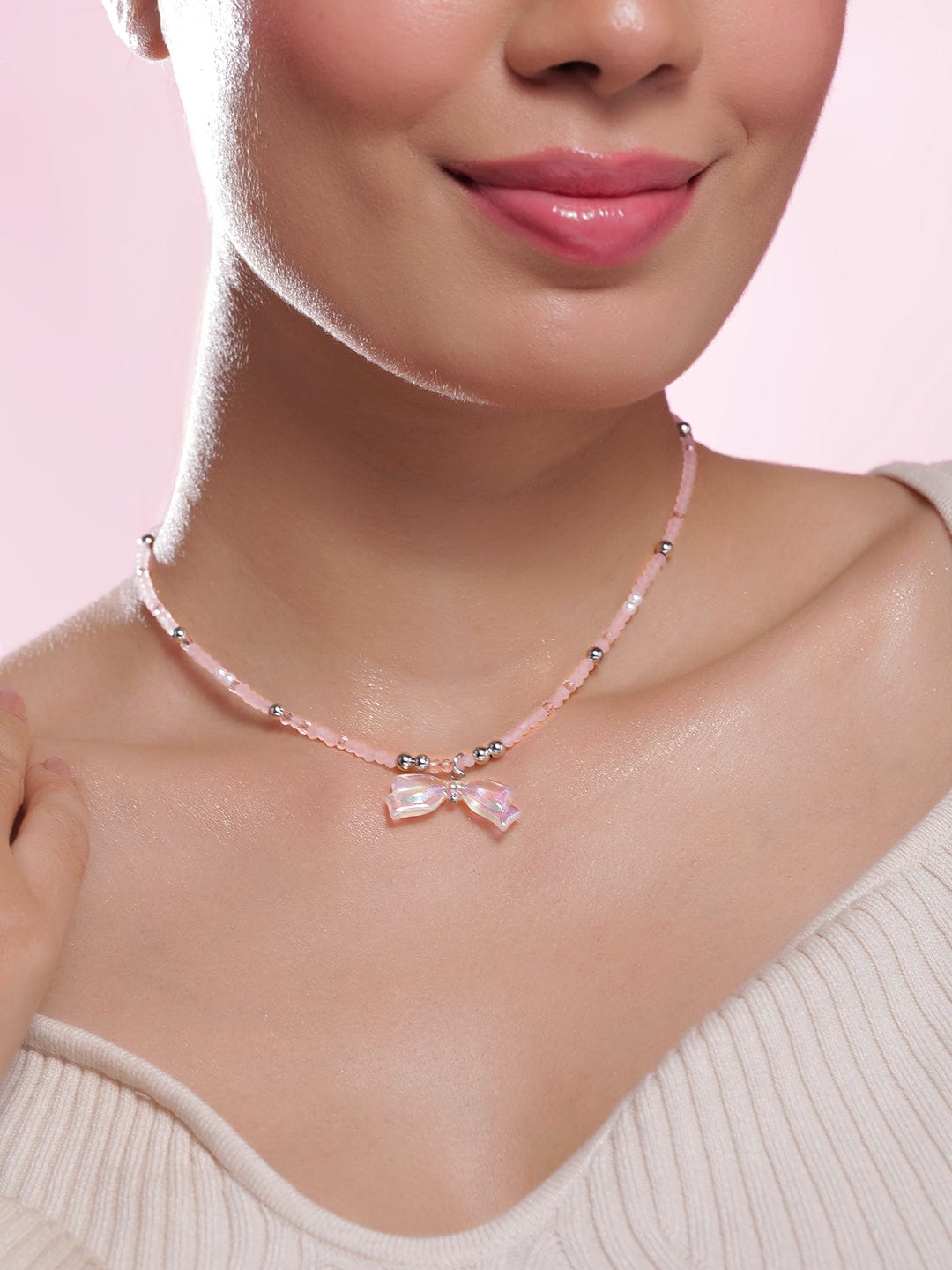 Necklace and Chains : This delicate necklace features soft pink beads complemented by a rhodium-plated chain, accented with silver-tone beads. The centerpiece is a charming iridescent butterfly bow pendant, adding a whimsical and graceful touch to your look. Perfect for a subtle yet stylish statement.