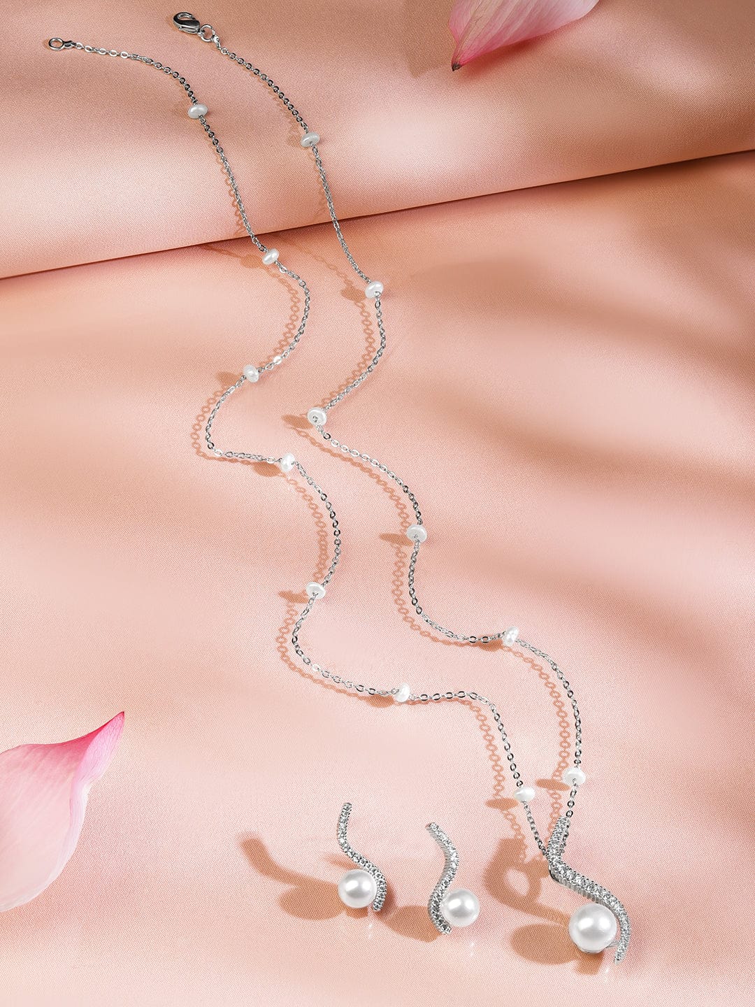 Pendent Set : This rhodium-plated pendant necklace set features a curved drop design with a pearl centre and white cubic zirconia detailing. A refined set perfect for women & girls for special events or elegant evenings.