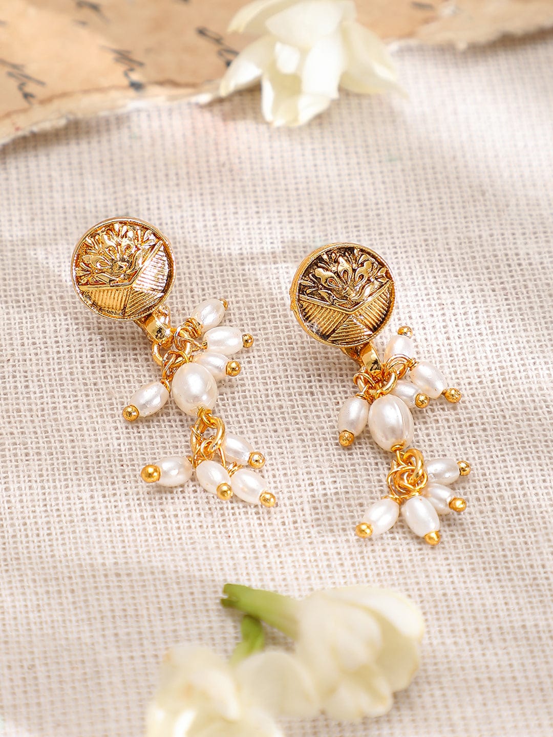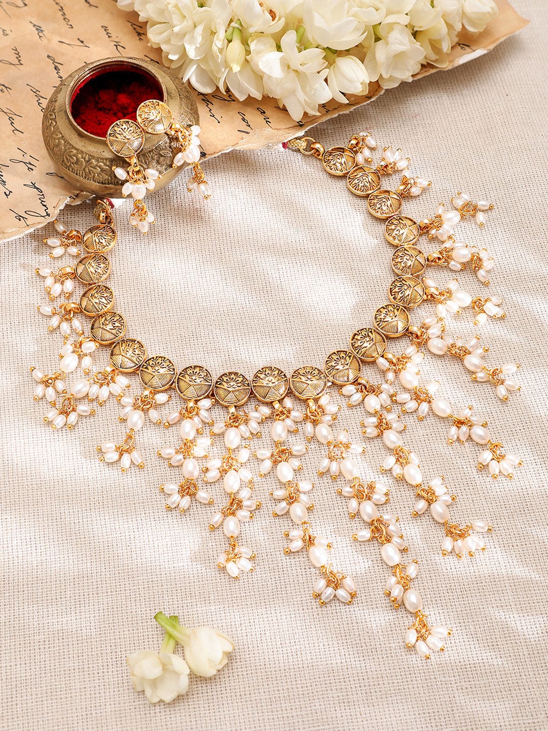 Rubans 22K Gold-Plated Coin Motif Necklace with White Beaded Pearl Dangling