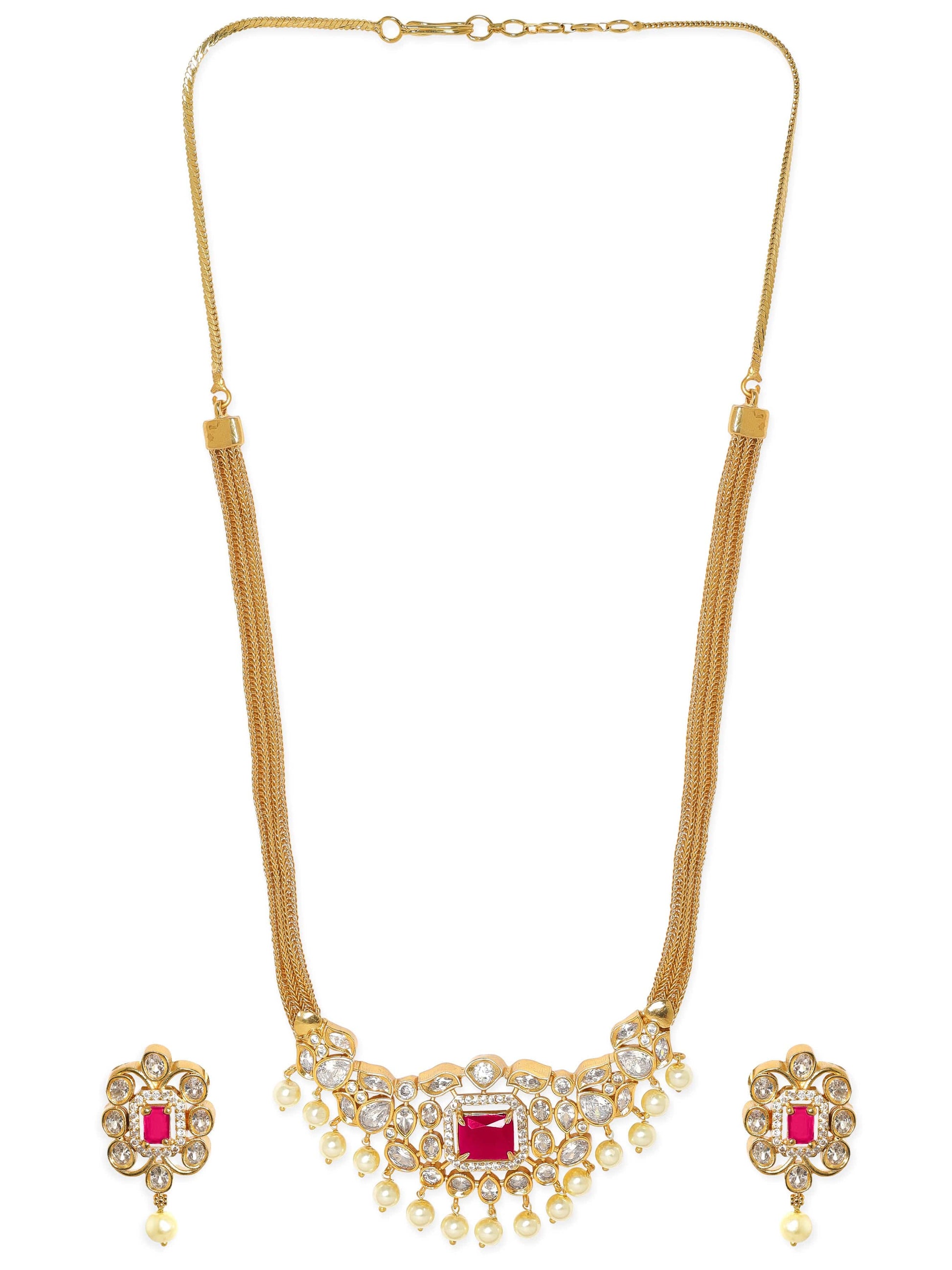 Rubans 22K Gold-Plated Ruby & CZ Studded Necklace & Earrings