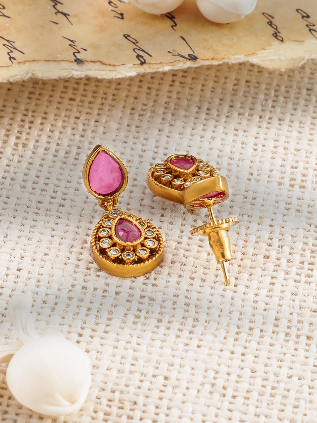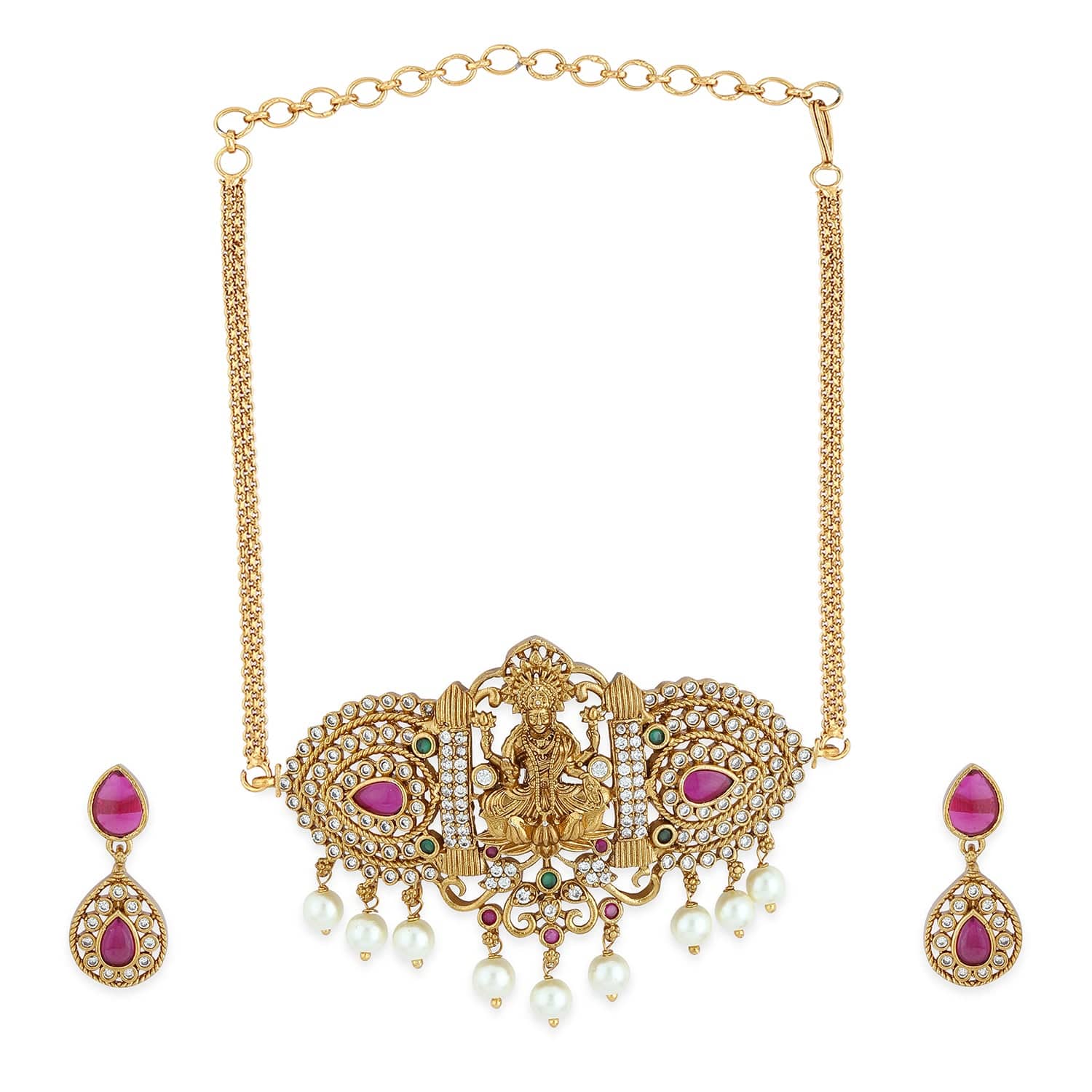 This divine Lakshmi temple choker necklace set by Rubans features 22K gold plating, embellished with ruby pink, emerald, and cubic zirconia stones, accented with pearl drops for a regal touch.