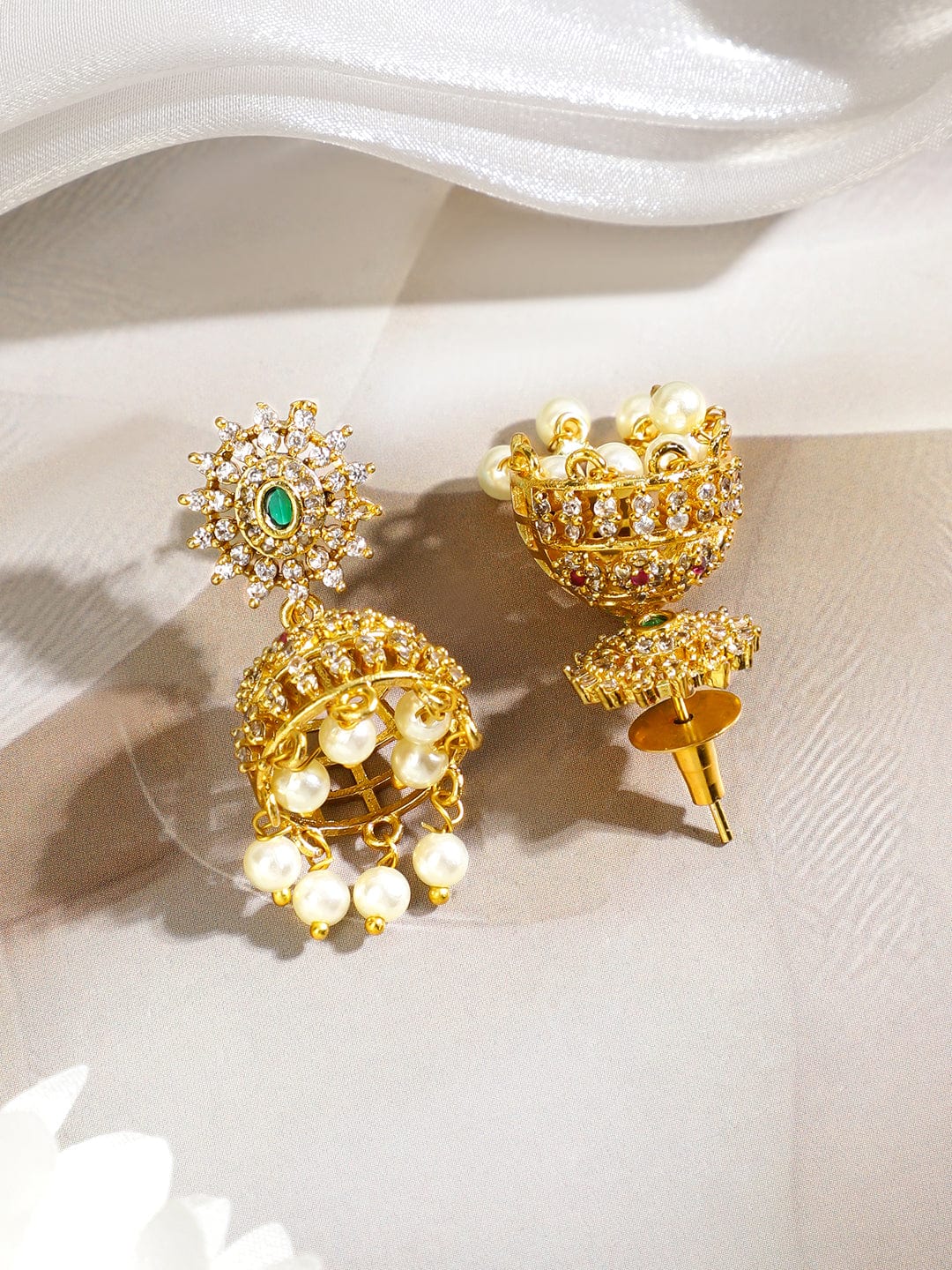 Rubans 22K Gold-Plated Choker Necklace Set with Emerald Green Ruby Pink & Cubic Zirconia Stones and Pearl Drops