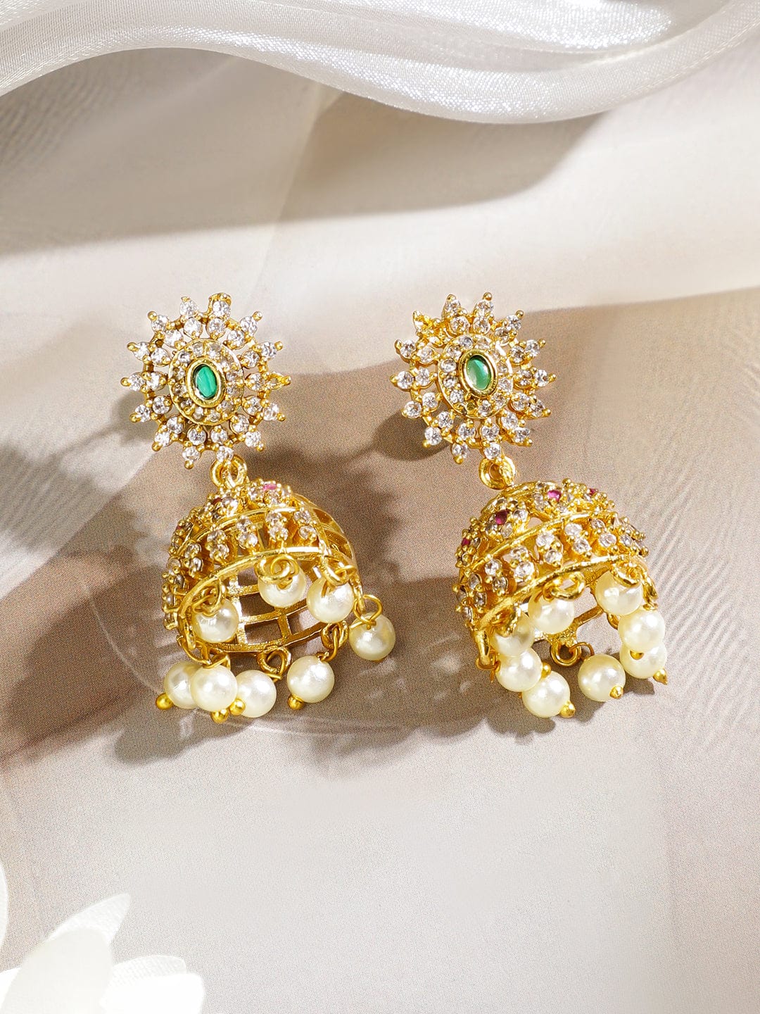 Jewellery Set : This 22K gold-plated choker set features floral detailing with emerald green, ruby pink, and cubic zirconia stones finished with pearl drops, ideal for bridal, festive, and ethnic wear.