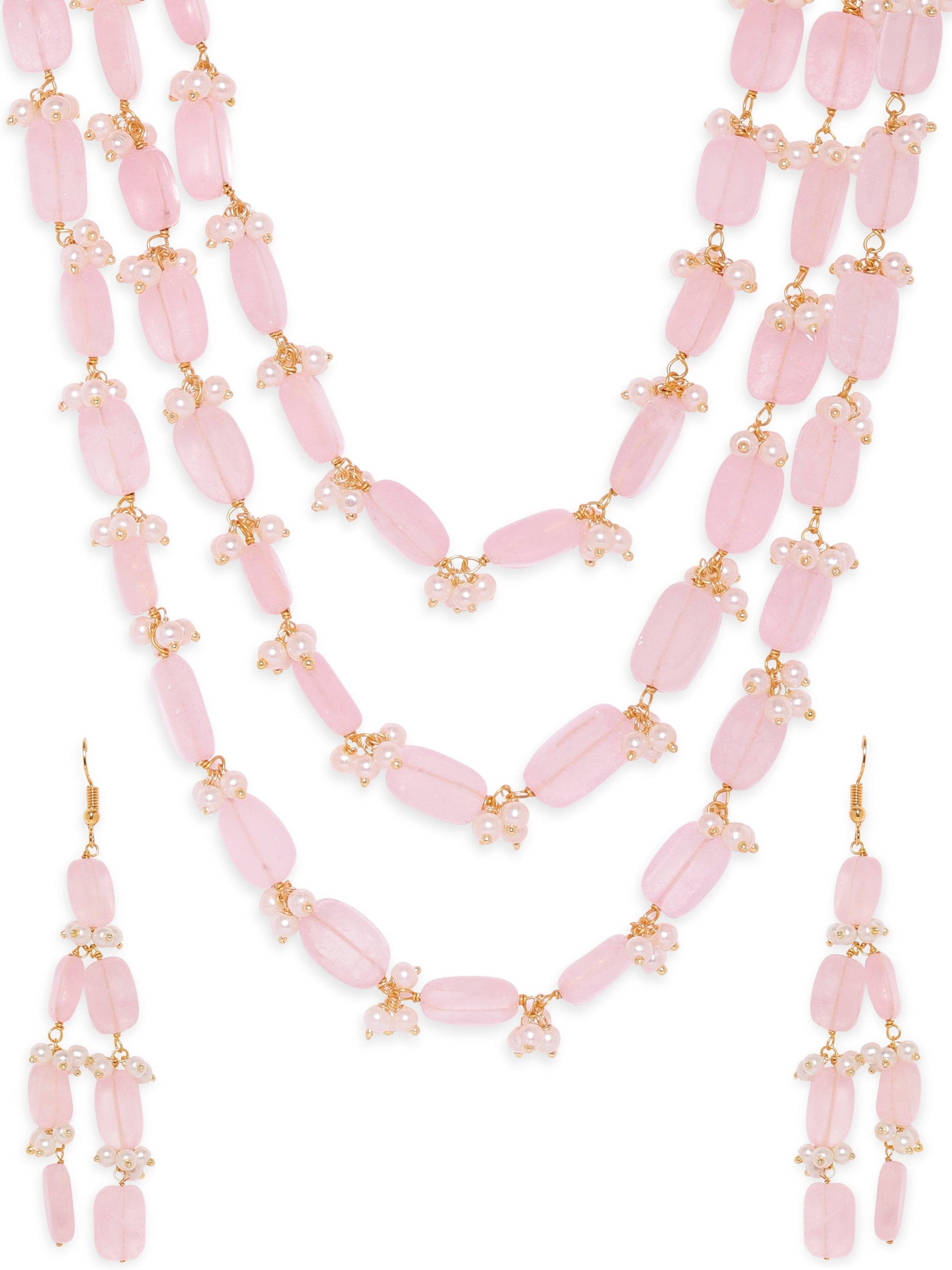 Rubans 22K Gold Plated Semi precious Rose quarts Gem Beaded Zirconia studded Multilayer Statement Necklace Set