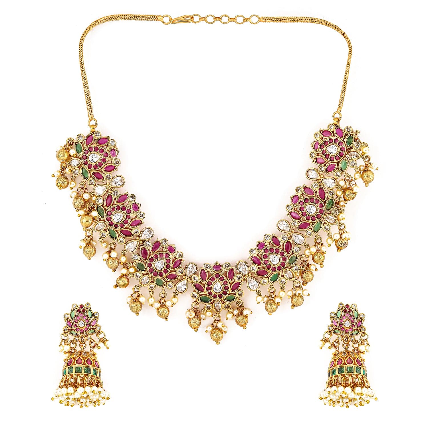 Rubans 22K Gold-Plated Ruby Pink, Emerald Green & White Kundan Studded Pearl Gold Beaded Necklace Set