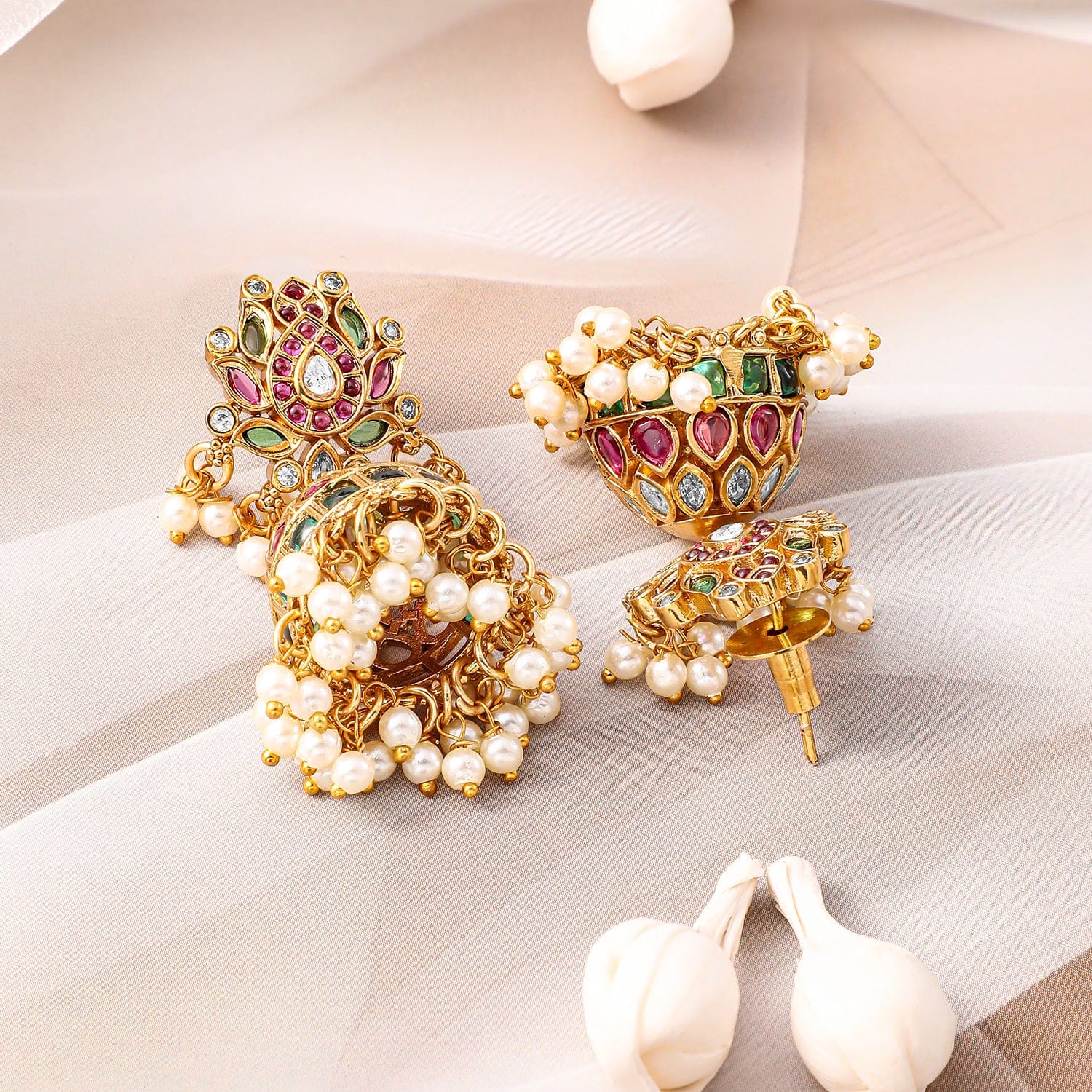 This exquisite 22K gold-plated necklace set features intricate floral motifs with stunning ruby pink, emerald green, and white kundan stones. The design is enhanced with delicate pearl beads, making it perfect for any traditional look.