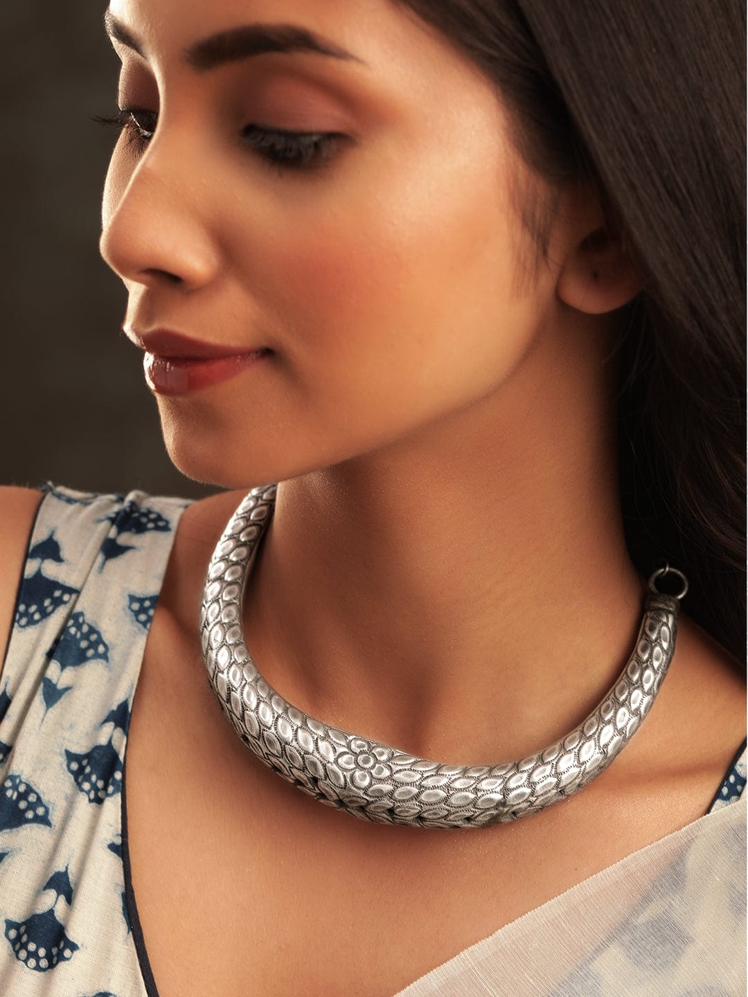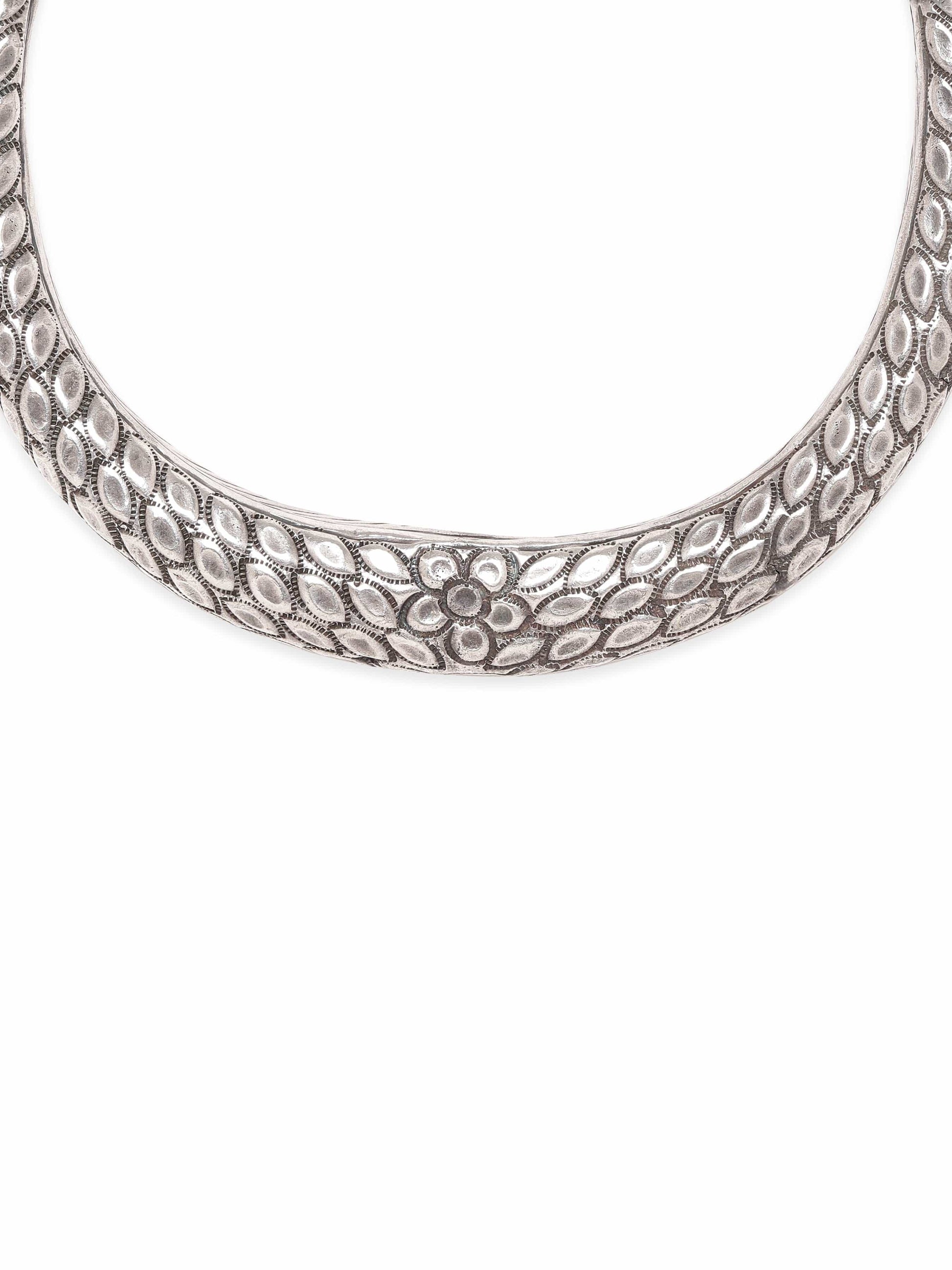 Elevate your style with this elegant choker necklace featuring an intricately designed , meticulously plated in oxidized silver. The delicate craftsmanship and floral pattern exude a timeless charm. The oxidized finish adds a touch of vintage allure to this piece.