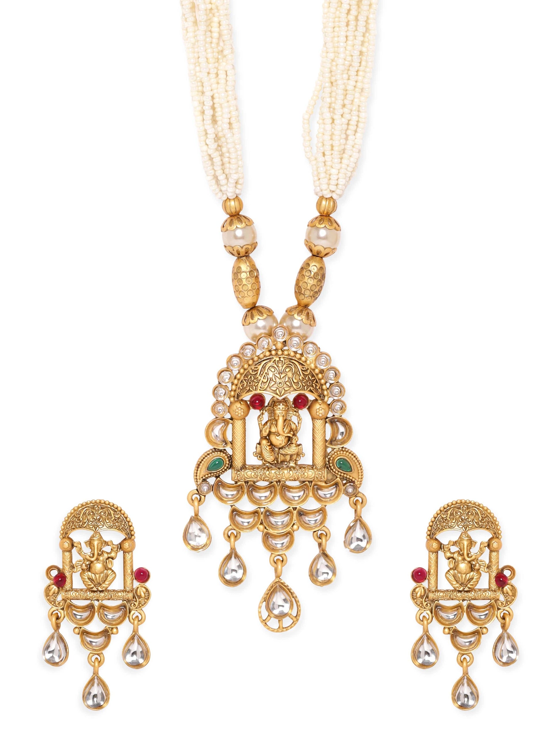 Rubans Lord Ganesha Temple Jewellery with White Beads Chain Necklace Set