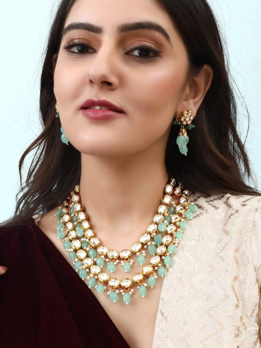 Rubans Luxury 24K Gold Plated Handcrafted Pachi Kundan & Green Beads Layered Necklace Set