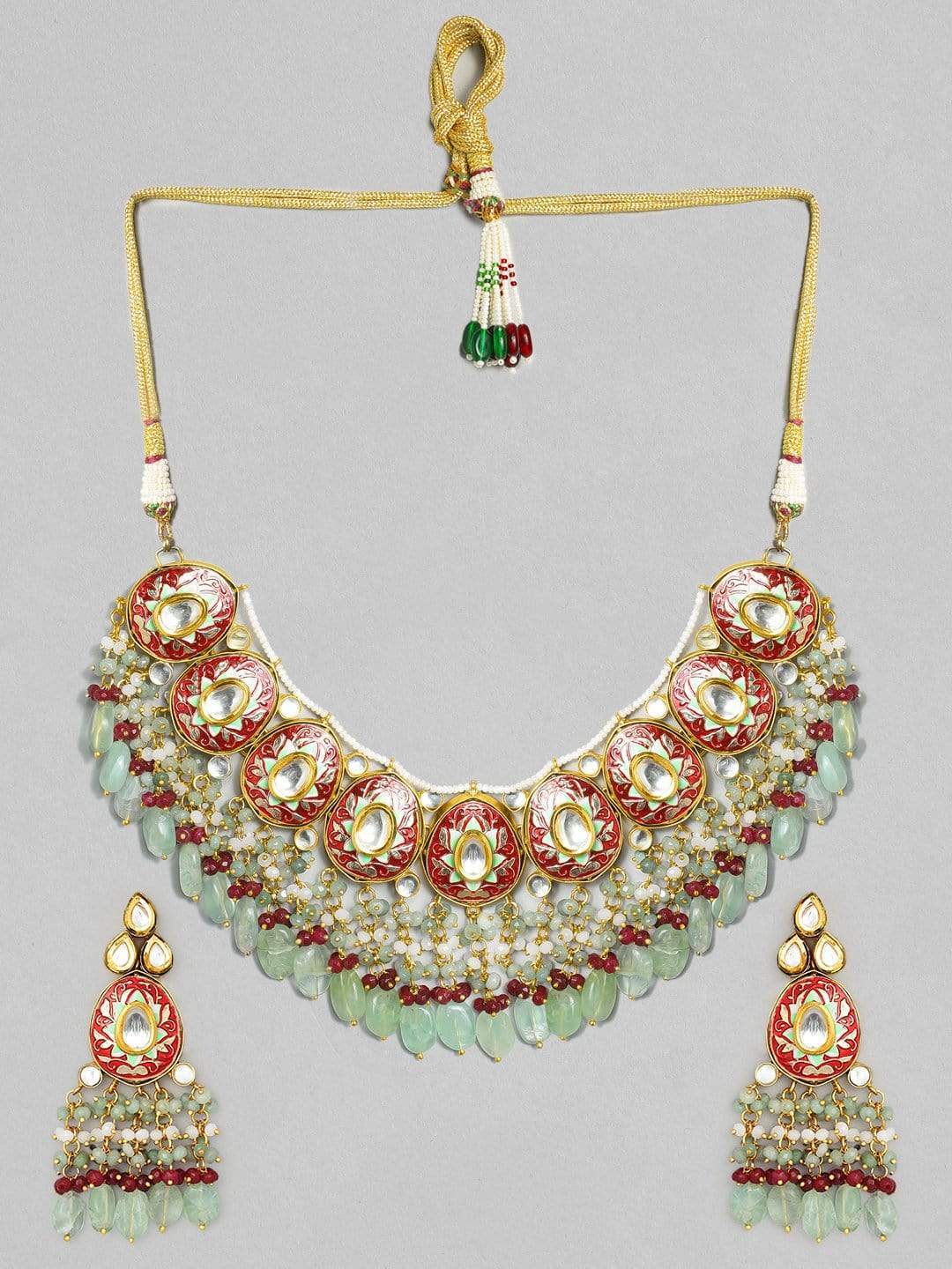 Rubans LUXURY Intricately Handcrafted 22Kt Gold Plated Traditional Red And Green Necklace Set