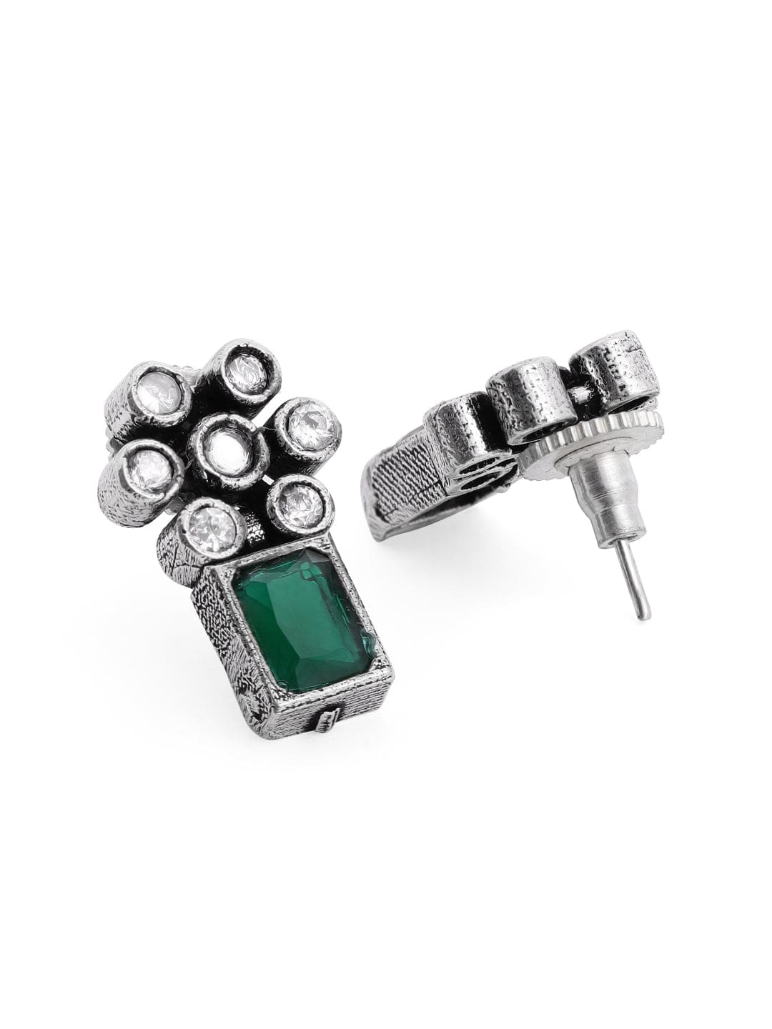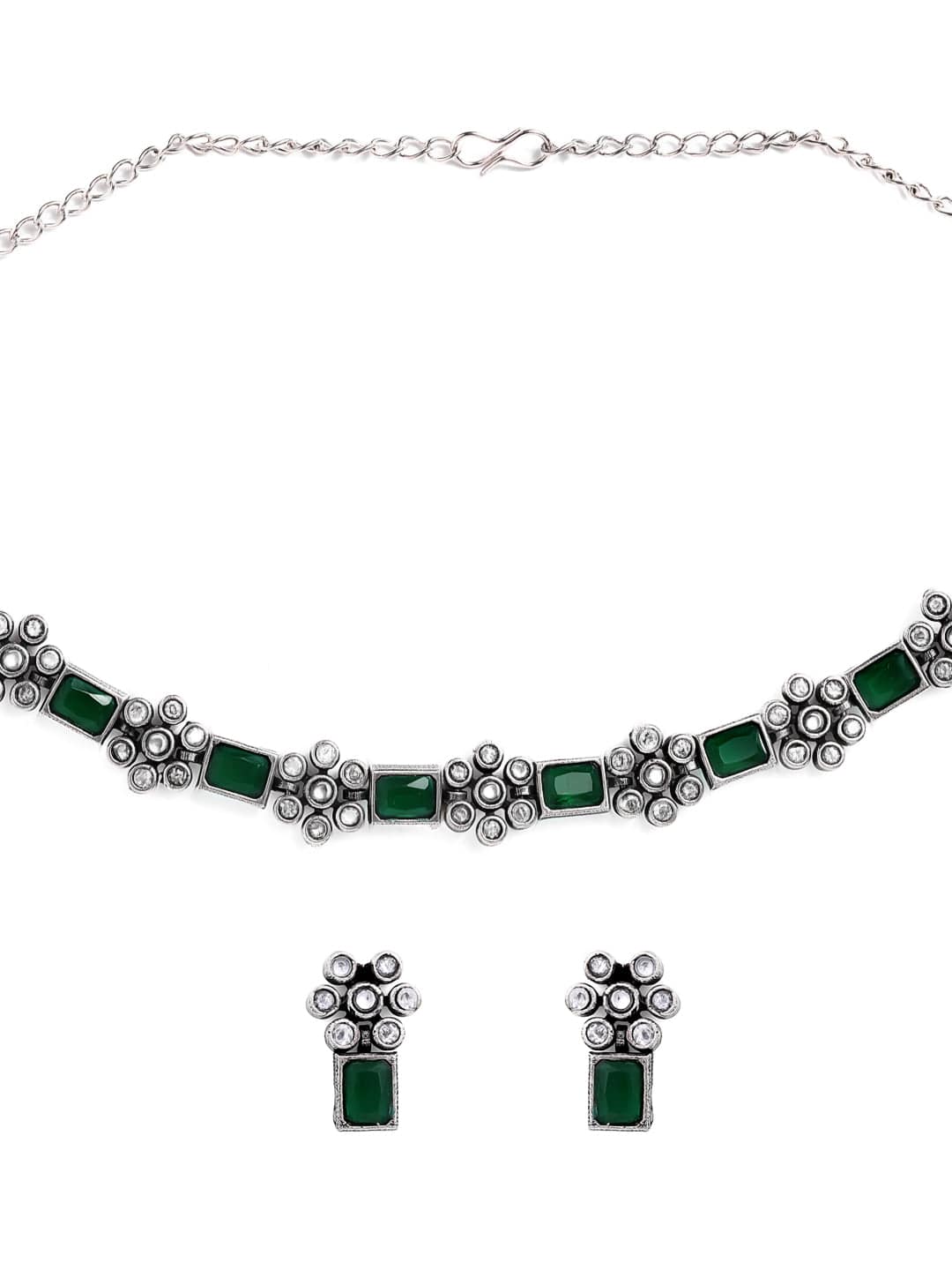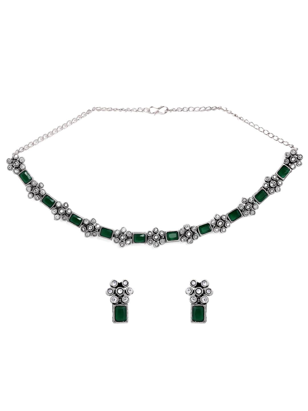 Rubans Oxidised Silver Plated Handcrafted Green Stone Floral Necklace Set