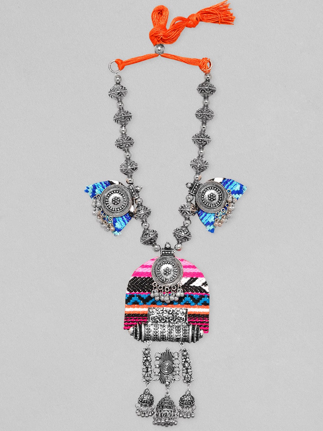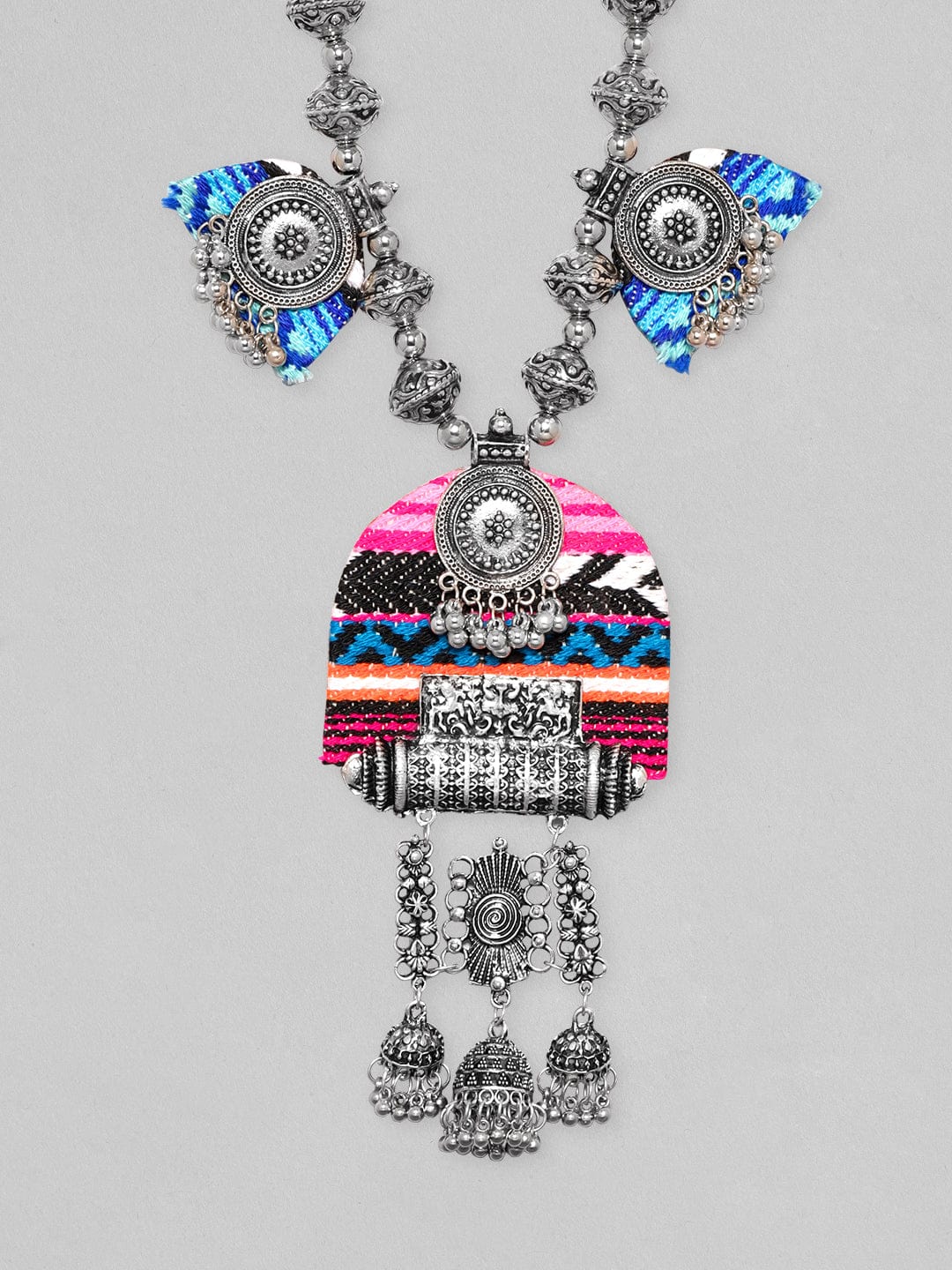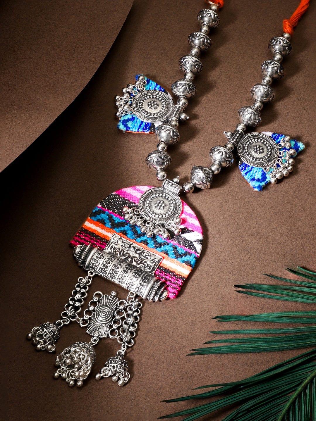 Rubans Oxidized Silver Plated Beaded & Threaded Statement Long Necklace