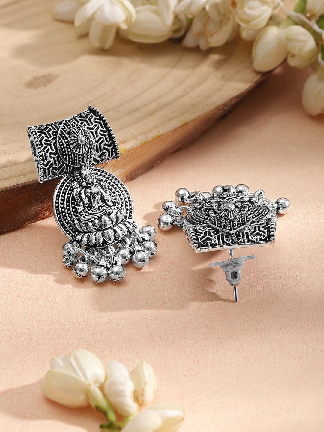 Necklace set: This oxidized silver-plated necklace set exudes traditional charm, featuring a striking design of engraved Goddess Lakshmi coin motifs adorned with intricate detailing. Accentuated with dangling silver beads, the necklace offers a bold, antique-inspired look, complemented by matching earrings that echo the same divine design. Perfect for adding a touch of cultural elegance, this set is ideal for pairing with ethnic attire to create a statement look.