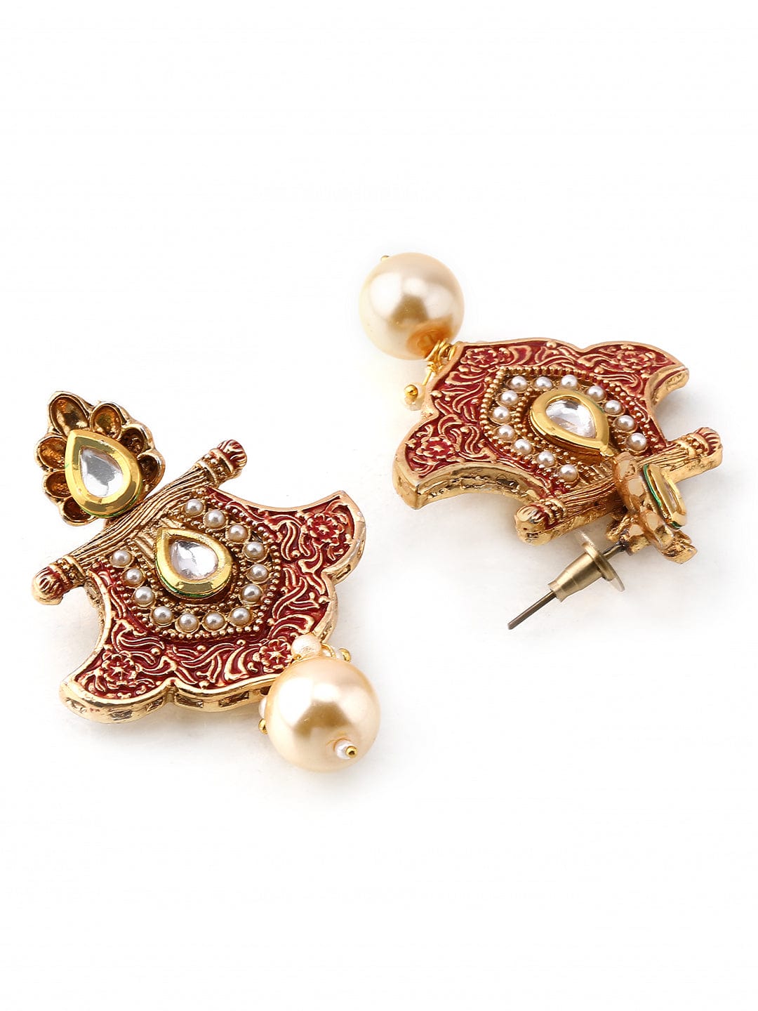 It's a jewellery set fit for the queens! Exude the royal vibe with this stone studded jewellery set. Consisting of a necklace, matching earrings, this necklace set is crafted from gold-plated brass, stones and beads.