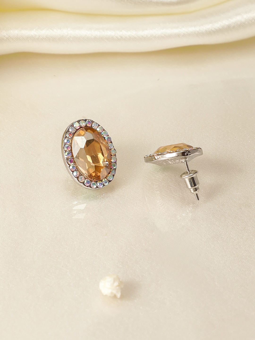 Rubans Rhodium Plated Pink & Golden Oval Cubic Zirconia Studded Statement Necklace Set