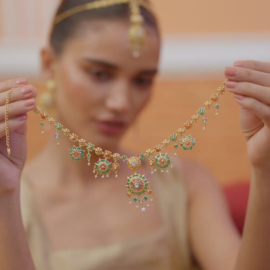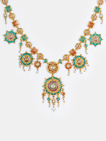 Silver Enamelled Necklace with motif inspired by the Mysore Palace, designed for the Bride, Her Tribe & the Full-On Wedding Vibe! Crafted in Gold Plated 925 Silver with Plique-a-jour Enamel in shades of Turquoise, Orange and Pink. Uniquely handcrafted, no two pieces are exactly alike! Here's something that you should know before buying this design, Gold Plated Jewellery will tarnish over a period of time, and quicker especially in humid places such as Mumbai and Chennai. For a longer lasting plating, the first step is to store your jewellery in a zip lock bag when you're not wearing it. Also, avoid direct contact with chemicals such as perfumes, sanitisers and the likes.